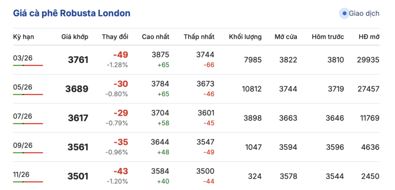 Kết thúc phiên giao dịch gần nhất, giá cà phê Robusta tại London tiếp tục sụt giảm đồng loạt trong các kỳ giao hàng. Cụ thể, kỳ giao tháng 1/2026 giảm 49 USD/tấn, xuống mức 3761 USD/tấn. Trong khi đó, hợp đồng giao kỳ hạn tháng 9/2026 cũng giảm 43 USD/tấn, đạt mức 3501 USD/tấn.
