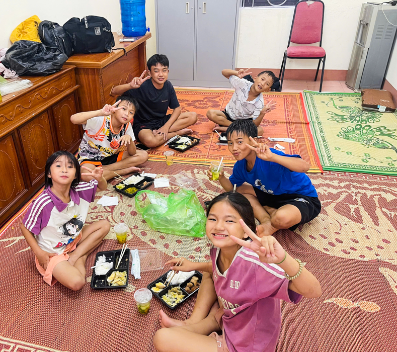 Các em nhỏ vui cười đón nhận suất ăn miễn phí tại khu tránh trú bão. Ảnh: Người dân cung cấp