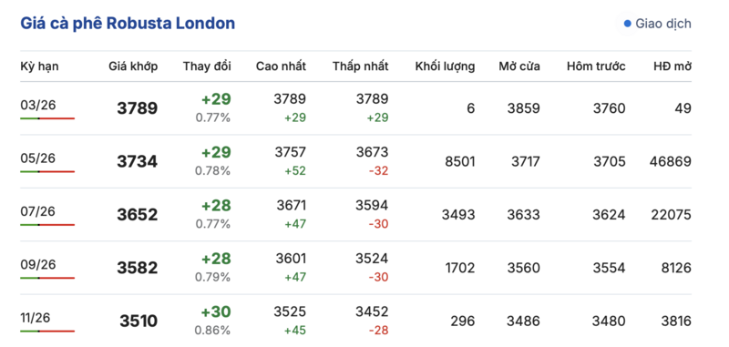 Cụ thể, kết thúc phiên giao dịch gần nhất, giá cà phê Robusta tại London ghi nhận phiên tăng nhẹ đồng loạt trong các kỳ giao hàng. Trong đó, kỳ giao tháng 1/2026 tăng 29 USD/tấn, đạt mức 3789 USD/tấn. Hợp đồng giao kỳ hạn tháng 11/2026 cũng tăng nhẹ 30 USD/tấn, lên mức 3510 USD/tấn.
