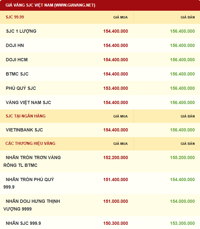 Giá vàng miếng được Công ty TNHH MTV Vàng bạc đá quý Sài Gòn - SJC, Bảo Tín Minh Châu, PNJ, Tập đoàn DOJI cùng niêm yết giá vàng ở mức 154,4 - 156,4 triệu đồng/lượng mua vào - bán ra. So với chốt phiên giao dịch hôm qua, giá vàng tăng 200.000 đồng/lượng.
