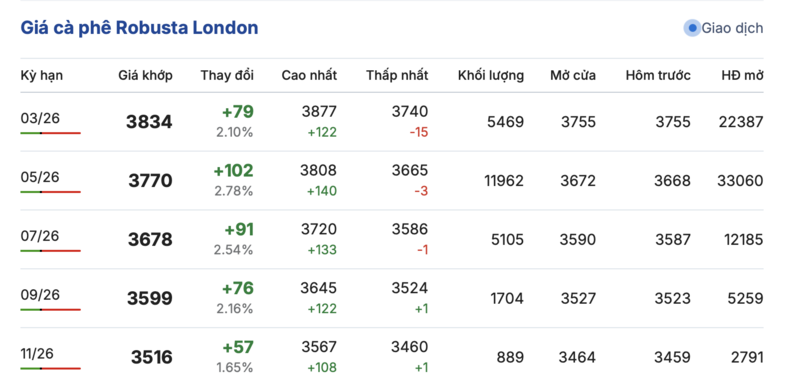 Kết thúc phiên giao dịch gần nhất, giá cà phê Robusta tại London đảo chiều tăng mạnh đồng loạt trong các kỳ giao hàng. Cụ thể, kỳ giao tháng 1/2026 tăng 79 USD/tấn, lên mức 3834 USD/tấn. Trong khi đó, hợp đồng giao kỳ hạn tháng 11/2026 cũng tăng 57 USD/tấn, đạt mức 3516 USD/tấn.