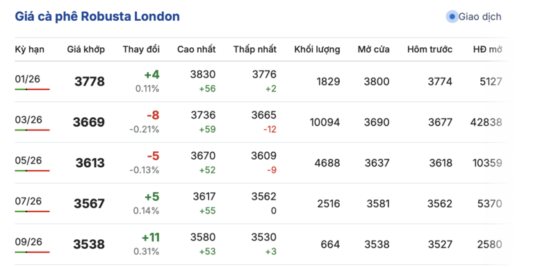 Kết thúc phiên giao dịch gần nhất, giá cà phê Robusta tại London biến động trái chiều các kỳ giao hàng. Cụ thể, kỳ giao tháng 1/2026 tăng nhẹ 4,0 USD/tấn, lên mức 3778 USD/tấn. Hợp đồng giao kỳ hạn tháng 5/2026 giảm nhẹ 5 USD/tấn, xuống mức 3613 USD/tấn.