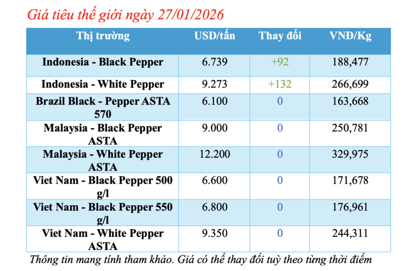 Cập nhật giá tiêu thế giới từ Hiệp hội Hồ tiêu Quốc tế (IPC) sáng 27/01/2026, hồ tiêu xuất khẩu hôm nay ghi nhận biến động mạnh từ thị trường Indonesia. Trong khi các thị trường khác đều duy trì mức giá ổn định so với phiên giao dịch hôm qua.