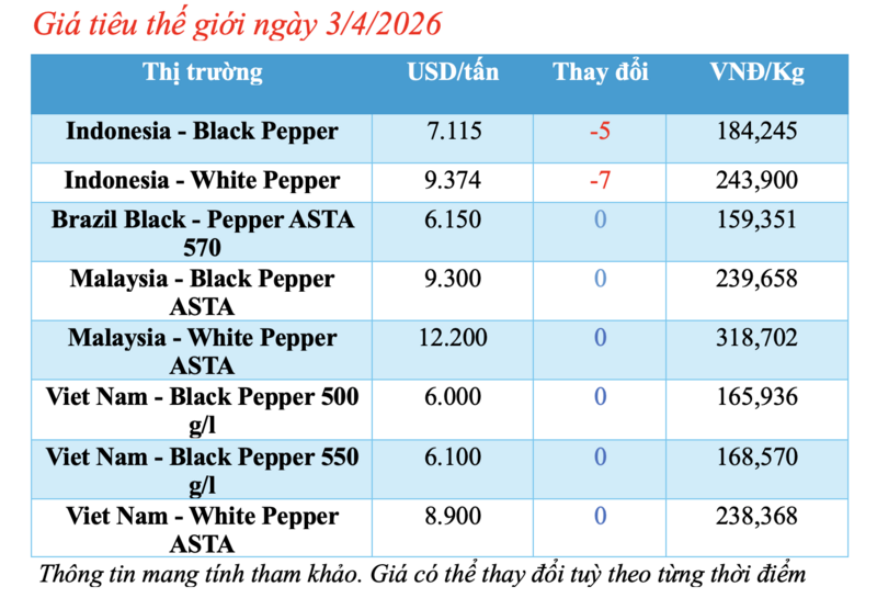 Tương tự, giá tiêu trắng Muntok của Indonesia cũng giảm nhẹ 7 USD/tấn so với ngày hôm qua, hiện đạt mức 9.374 USD/tấn.