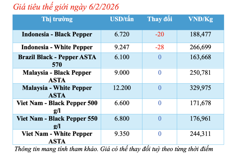 Cập nhật giá tiêu thế giới từ Hiệp hội Hồ tiêu Quốc tế (IPC) sáng 6/2/2026, hồ tiêu xuất khẩu hôm nay tiếp tục ghi nhận biến động mới từ thị trường Indonesia. Các thị trường khác đều duy trì mức giá ổn định so với phiên giao dịch hôm qua.