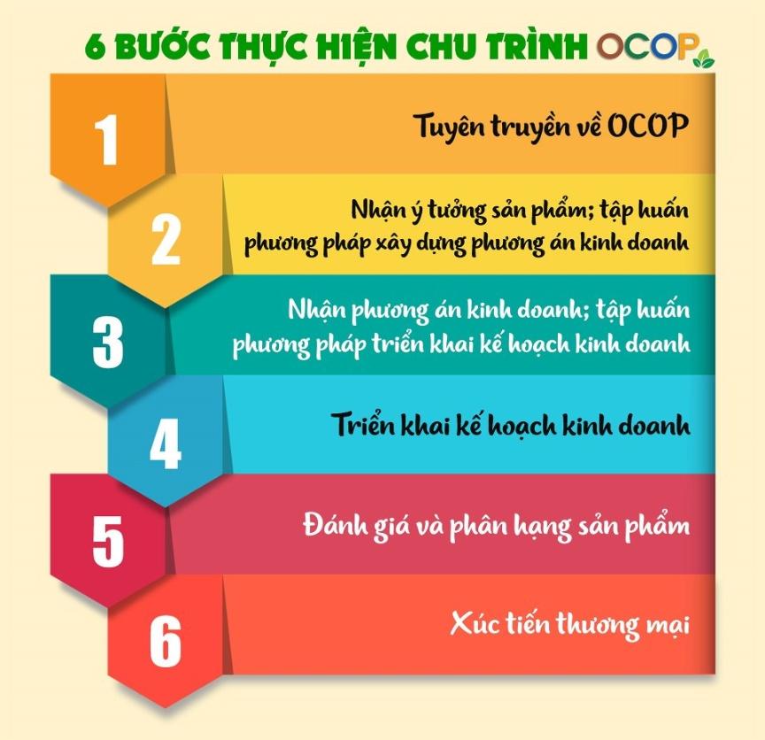 Theo quy định, chu trình chứng nhận sản phẩm OCOP gồm 6 bước như: bước 1, tuyên truyền về OCOP. Thời gian thực hiện bước 1 liên tục trong năm, trọng tâm vào tháng 2 hàng năm. Bước 2 là nhận ý tưởng sản phẩm; tập huấn phương pháp xây dựng phương án kinh doanh với thời gian thực hiện vào tháng 3 hàng năm. Bước 3 là nhận phương án kinh doanh, thời gian thực hiện vào tháng 4 hàng năm; tập huấn phương pháp triển khai kế hoạch kinh doanh vào tháng 5 hàng năm. Bước 4, triển khai kế hoạch kinh doanh, với thời gian thực hiện liên tục từ khi kế hoạch kinh doanh được duyệt. Bước 5, đánh giá và phân hạng sản phẩm. Ở bước này, toàn bộ các sản phẩm đăng ký tham gia Chương trình OCOP đều phải được đánh giá và xếp hạng, dựa trên Bộ tiêu chí đánh giá, xếp hạng sản phẩm, được quy định tại Quyết định số 490/QĐ-TTg, ngày 7/5/2018 của Thủ tướng Chính phủ. Bước cuối cùng là xúc tiến thương mại. Ở bước này, các sản phẩm dự thi đạt 3 sao trở lên sẽ được hỗ trợ xúc tiến thương mại tại các cấp tương ứng nhằm thúc đẩy tiêu thụ sản phẩm tại thị trường địa phương, tỉnh, quốc gia và quốc tế.