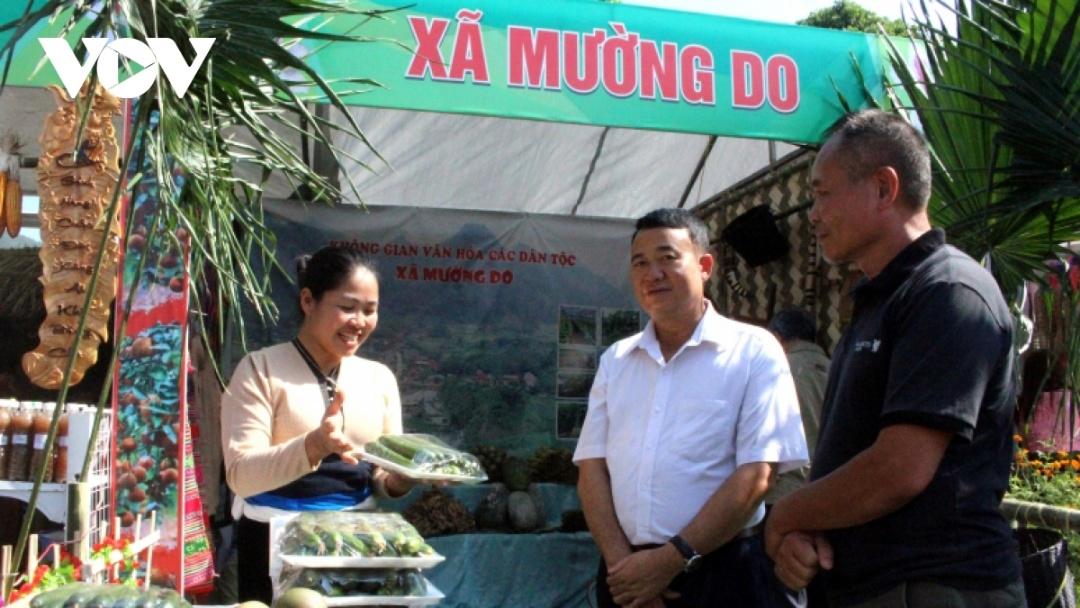 Các sản phẩm chanh leo, dưa chuột,... của xã Mường Do được giới thiệu tại gian hàng.