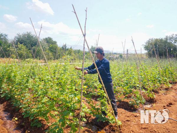 Giữa cái nắng tháng Tư, chúng tôi về cánh đồng Chà Vum của thôn Lương Tri, xã Nhơn Sơn (Ninh Sơn). Vùng đất có diện tích trên 300 ha, trước đây chỉ trồng được một vụ lúa rồi lại cày ải, phơi đất trắng đồng vì thiếu nước sản xuất đến nay đã đổi thay. Người dân không còn thấp thỏm lo thiếu nước tưới trong mùa nắng hạn. Dòng nước mát của hệ thống thủy lợi Tân Mỹ không những giúp bà con chủ động nước tưới quanh năm, canh tác lúa 3 vụ/năm hiệu quả, mà còn cải tạo, mở rộng phát triển các loại cây hoa màu, mía, cỏ chăn nuôi... Ông Đạo Văn Truyền, thôn Lương Tri, phấn khởi chia sẻ: Cánh đồng Chà Vum lúc trước chỉ canh tác được 1 vụ lúa phụ thuộc vào nước trời, mùa được, mùa không. Từ ngày có hệ thống thủy lợi dẫn nước về tận chân ruộng, việc sản xuất có tính chủ động nên năng suất cây trồng tăng cao, bà con nơi đây ai cũng vui mừng cày xới đất để làm lại, không còn bỏ đất như trước.
