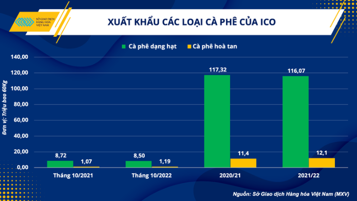 Trong báo cáo thị trường cà phê tháng 10 của ICO, xuất khẩu cà phê dạng hạt đạt 8,5 triệu bao, giảm 2,5% so với 8,72 triệu bao của cùng tháng năm trước. Trong khi, tổng xuất khẩu cà phê hòa tan tăng 10,9% trong tháng 10/2022 lên 1,19 triệu bao, nâng tỷ trọng lên 9,5% trong tháng 10 năm nay, so mức 8,9% của cùng kỳ năm ngoái.