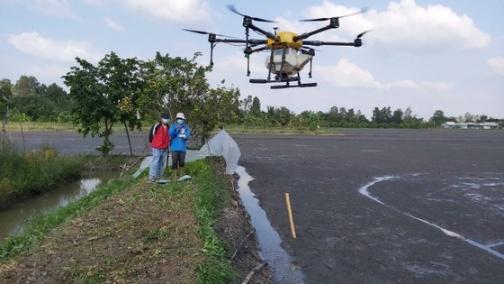 Nông dân Hậu Giang sử dụng drone bay phun thuốc đúng liều lượng hạn chế được thuốc bảo vệ thực vật.