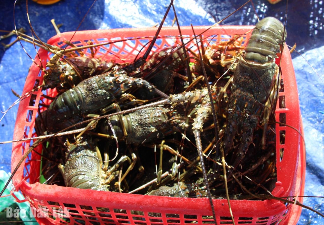 Thương lái thu mua tôm hùm dọc bờ Vịnh Xuân Đài. |