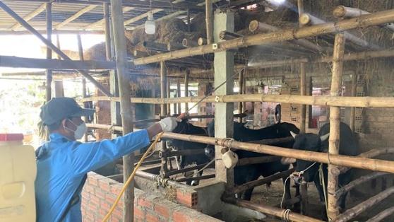 Ngành nông nghiệp tỉnh Bình Định triển khai phun thuốc khử khuẩn, phòng bệnh cho đàn trâu bò. Ảnh: Tường Quân - TTXVN