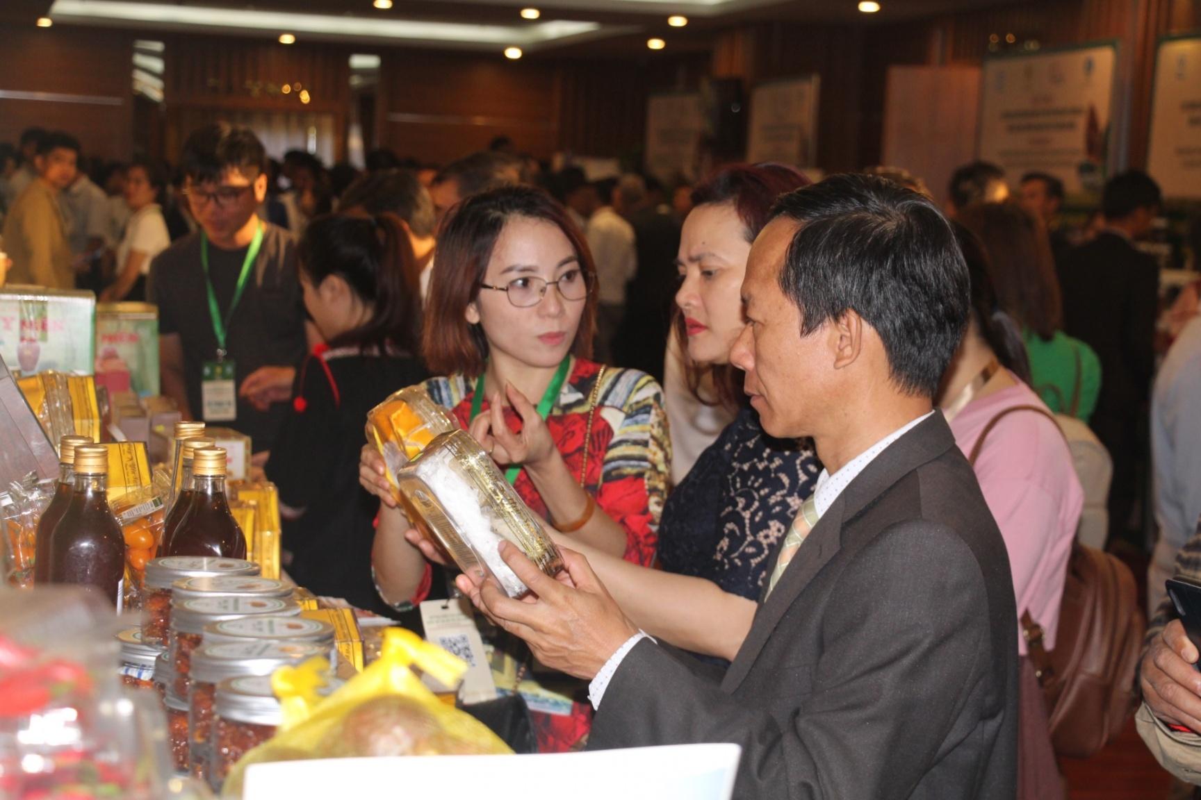 Bộ trưởng Bộ NN-PTNT Lê Minh Hoan (giữa) tham quan các gian hàng trưng bày tại Hội thảo.