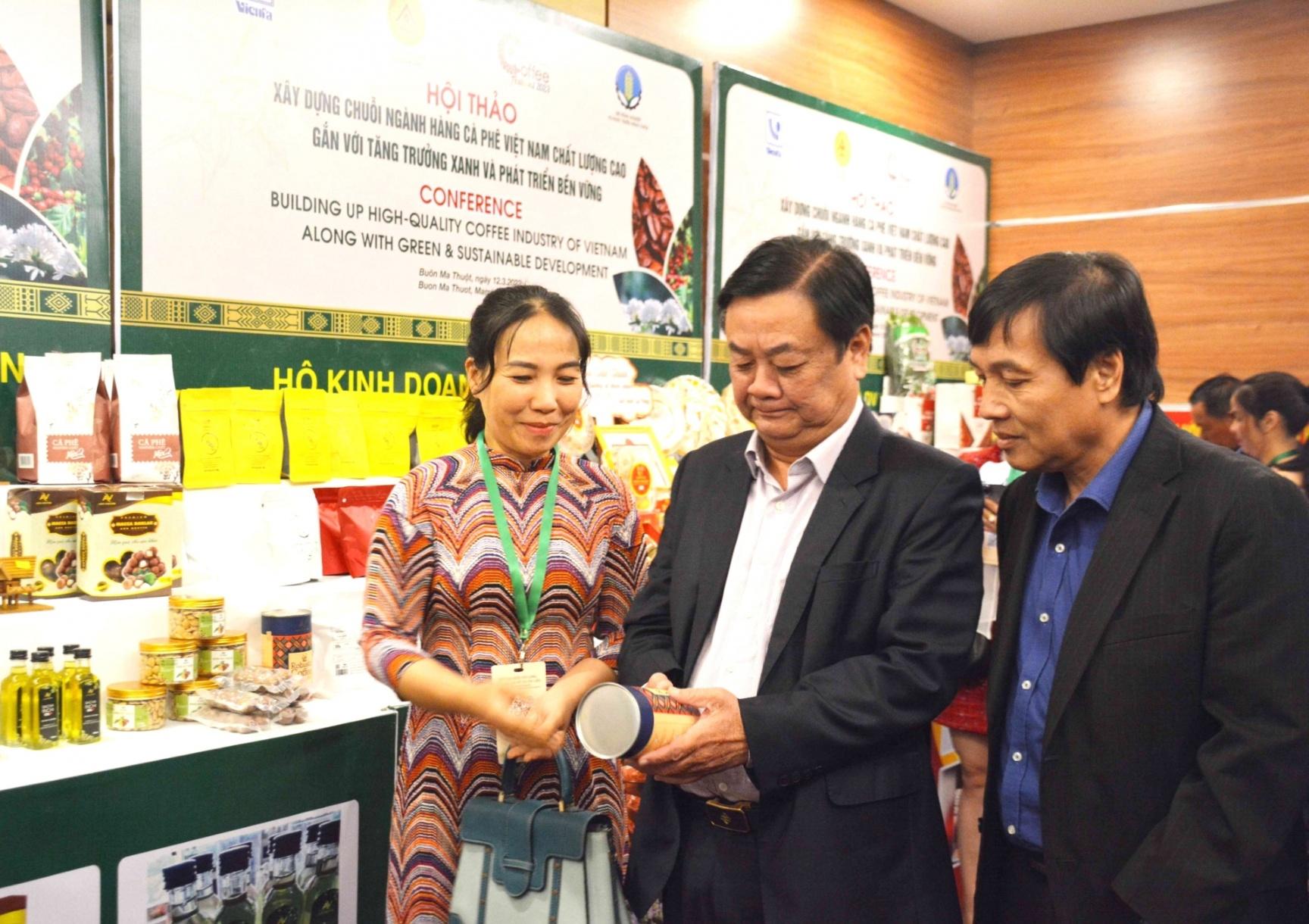 Các đại biểu tìm hiểu sản phẩm cà phê tại Hội thảo xây dựng chuỗi ngành hàng cà phê Việt Nam chất lượng cao gắn với tăng trưởng xanh và phát triển bền vững.