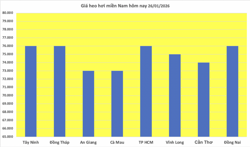 Trong khi đó, An Giang và Cà Mau tiếp tục là hai địa phương có mức giá thấp nhất khu vực, cùng đi ngang tại 73.000 đồng/kg.