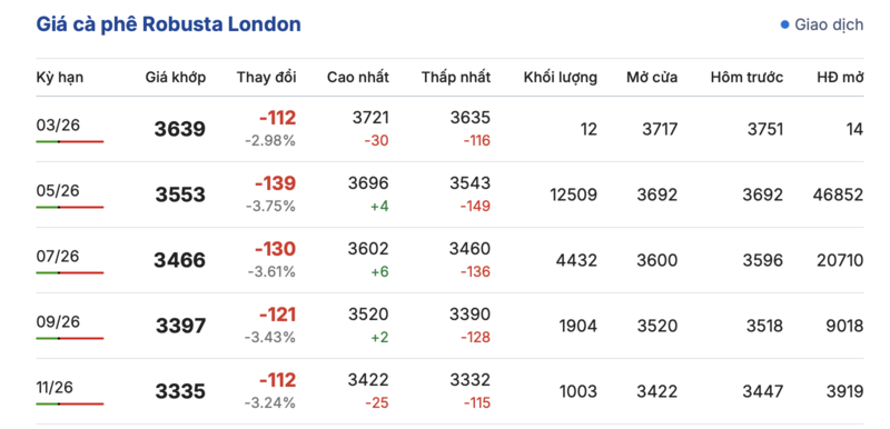 Cụ thể, kết thúc phiên giao dịch gần nhất, giá cà phê Robusta tại London ghi nhận phiên giảm giá sâu. Trong đó, kỳ giao tháng 1/2026 giảm đến 112 USD/tấn, xuống mức 3.639 USD/tấn. Hợp đồng giao kỳ hạn tháng 11/2026 cũng giảm mạnh 121 USD/tấn, xuống mức 3.397 USD/tấn.