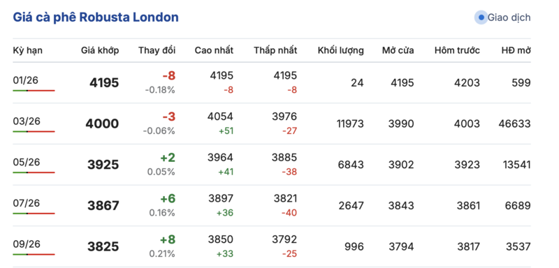 Kết thúc phiên giao dịch gần nhất, giá cà phê Robusta tại London biến động trái chiều trong các kỳ giao hàng. Cụ thể, kỳ giao tháng 1/2026 đảo chiều giảm nhẹ 8 USD/tấn, xuống mức 4195 USD/tấn. Trong khi đó, hợp đồng giao kỳ hạn tháng 9/2026 lại tăng thêm 8 USD/tấn, đạt mức 3825 USD/tấn.