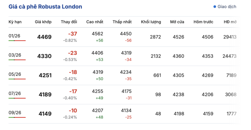 Kết thúc phiên giao dịch gần nhất, giá cà phê Robusta tại London giảm nhẹ đồng loạt qua các kỳ giao hàng. Cụ thể, kỳ giao tháng 1/2026 giảm nhẹ 37 USD/tấn, xuống mức 4469 USD/tấn. Trong khi hợp đồng giao kỳ hạn tháng 9/2026 cũng giảm nhẹ 10 USD/tấn, đạt mức 4149 USD/tấn.