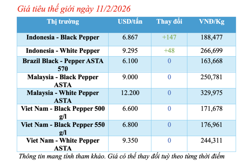 Cập nhật giá tiêu thế giới từ Hiệp hội Hồ tiêu Quốc tế (IPC) sáng 11/2/2026, hồ tiêu xuất khẩu hôm nay ghi nhận biến động mạnh từ thị trường Indonesia. Các thị trường đều duy trì mức giá ổn định so với phiên giao dịch hôm qua.